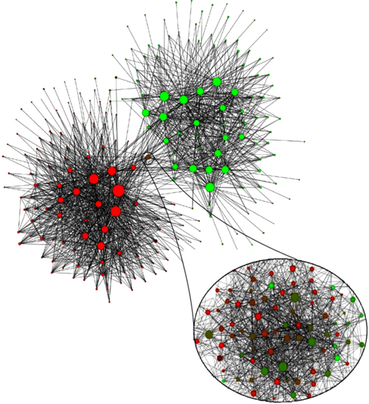 What does the intermediate community of mixed colours between the two main clusters represent?