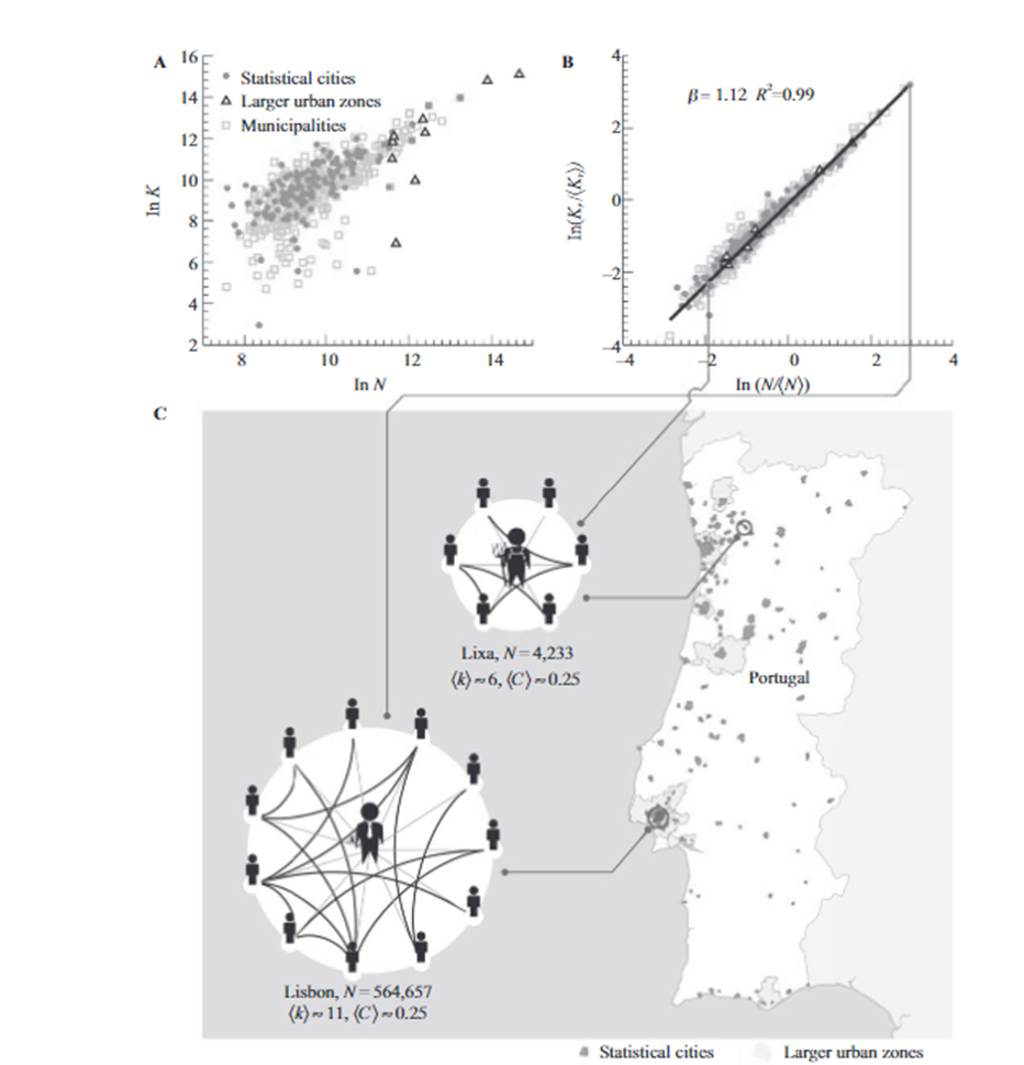 An average urban dweller in the capital, Lisbon, has approximately twice as many reciprocated mobile phone contacts, k, as an average individual in the rural town of Lixa.