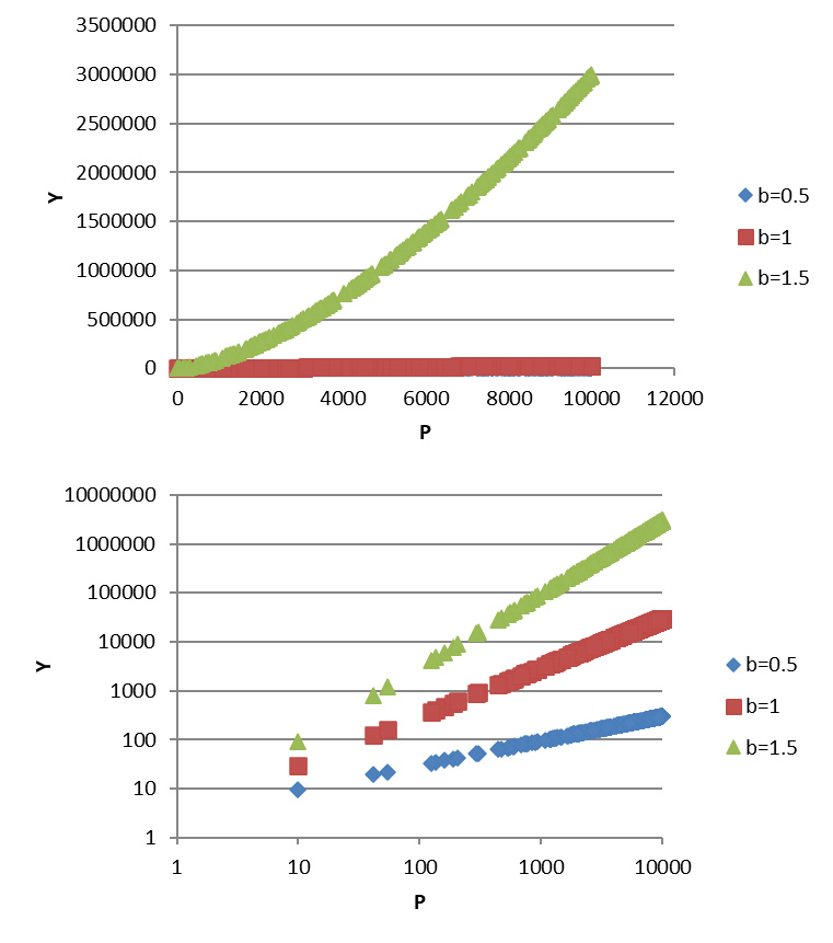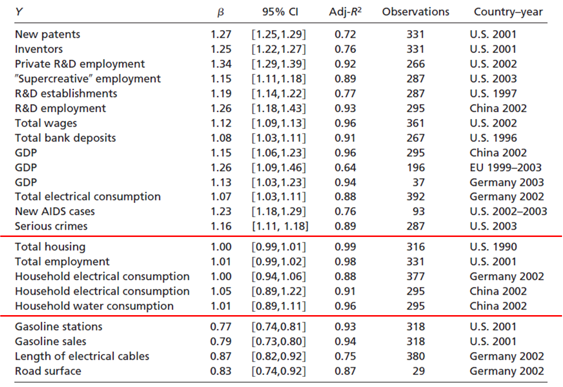 \(Y_i\): material resources (energy or infrastructure) or social activity (wealth, patents, and pollution) in city \(i\)
