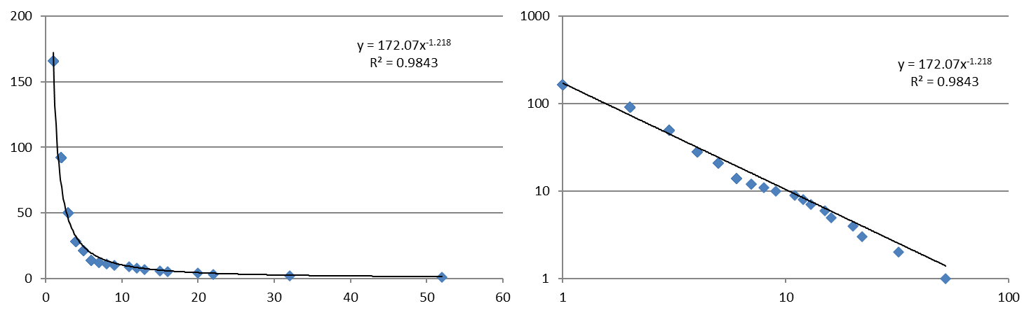 Empirical verification of the functions that better explain the node degree distribution (power vs. exponential functions)