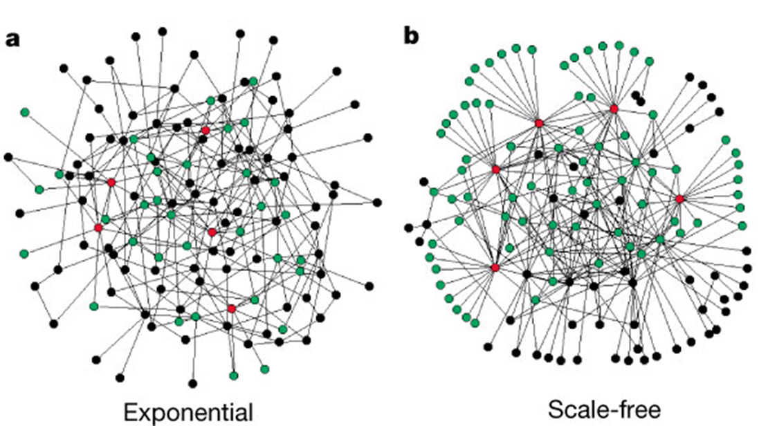preferential attachment: growth is not equally dispersed across the nodes; highly connected nodes are more likely to receive new links than the lower degree nodes